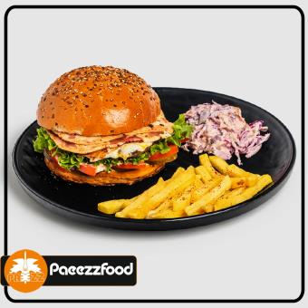 خمير آمريكايي ، سس مخصوص ، گوشت طعم دار گريل شده ،پنير ، قارچ طعم دار ، فلفل دلمه اي