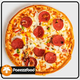 خمیر آمریکایی+گوشت گوساله+قارچ+سس مخصوص+فلفل دلمه ای+پنیر پیتزا