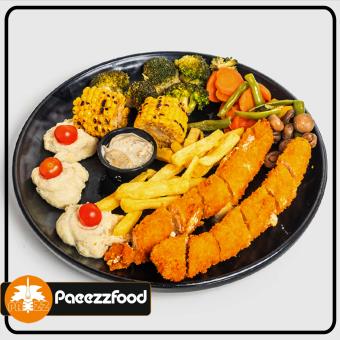 3 عدد سینه استیک گریل شده، پوره سیب زمینی، کلم بروکلی، قارچ، هویج، ذرت، فلفل دلمه ای، لوبیا سبز، سیب زمینی با سس قارچ